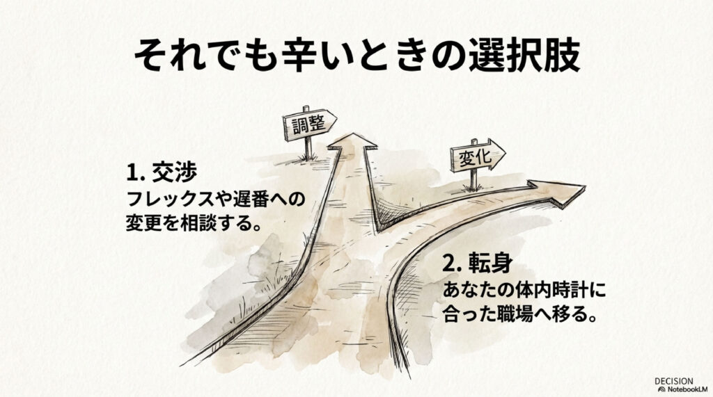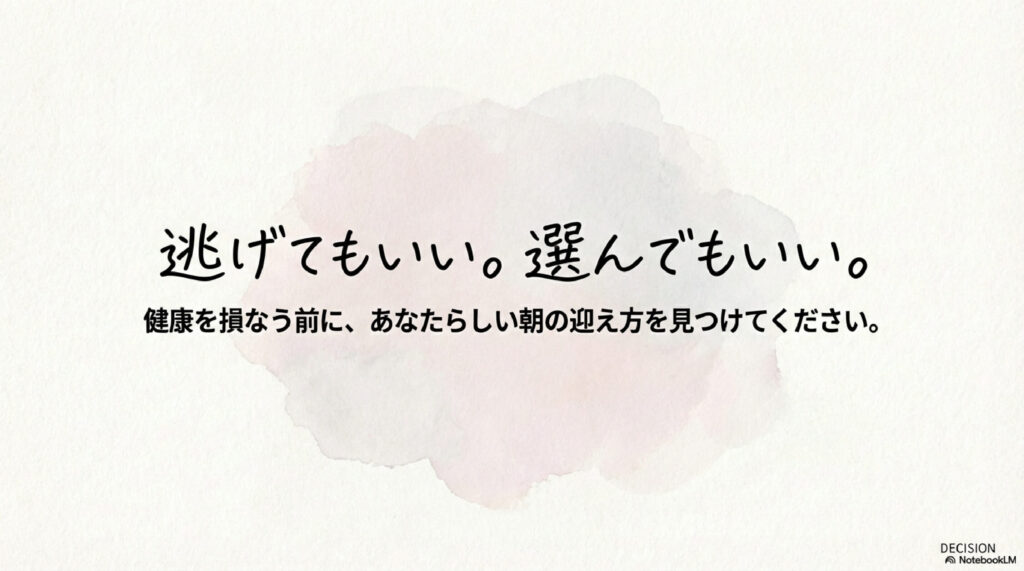 健康を損なってまで早朝勤務を続けるより、自分に合った環境を探す方が長期的には賢明な判断といえます。
