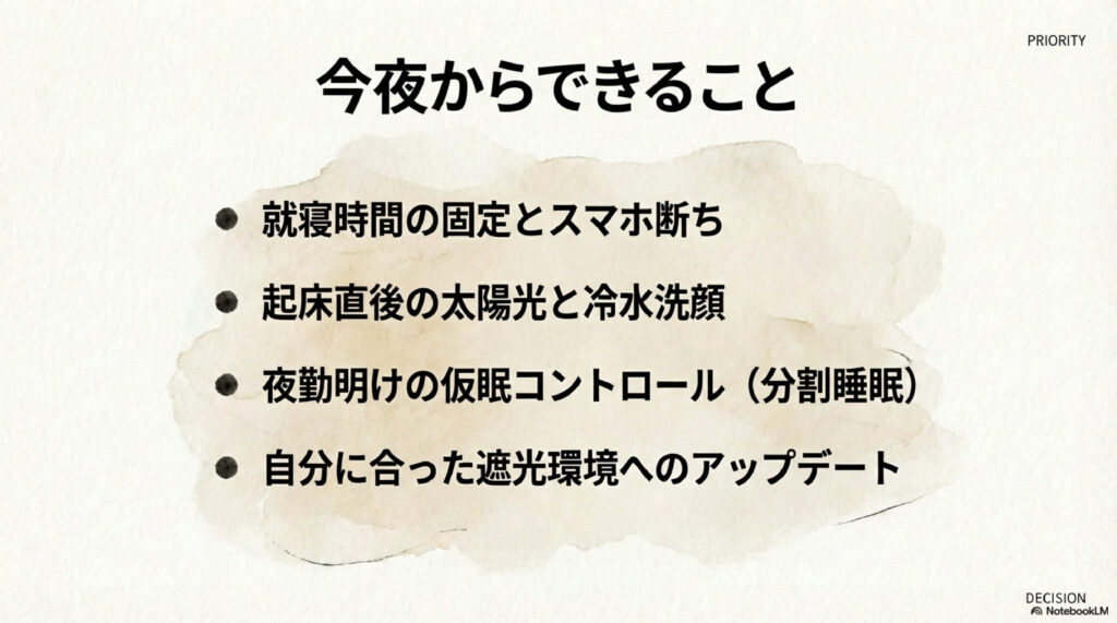 「少し寝れば大丈夫」と過信せず、遮光カーテンやアイマスクで脳をしっかり「夜モード」に切り替えましょう。