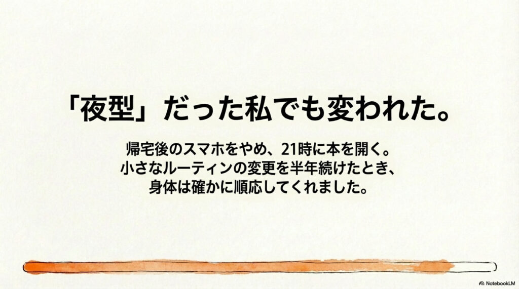 実際に夜型から朝型へ改善した成功事例もあるため、自分に合った方法を見つけて実践すれば必ず克服できます。