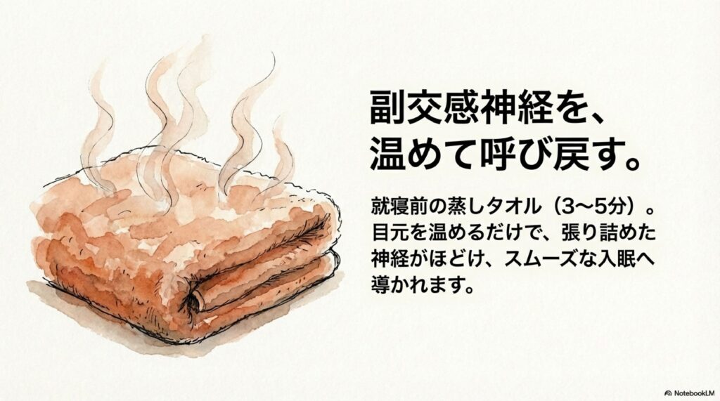 就寝前に蒸しタオルで目元を3〜5分温めると、副交感神経が優位になり入眠しやすくなります。