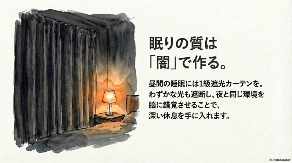 日中に睡眠をとる際は、遮光カーテンで部屋を暗くすることが不可欠です。